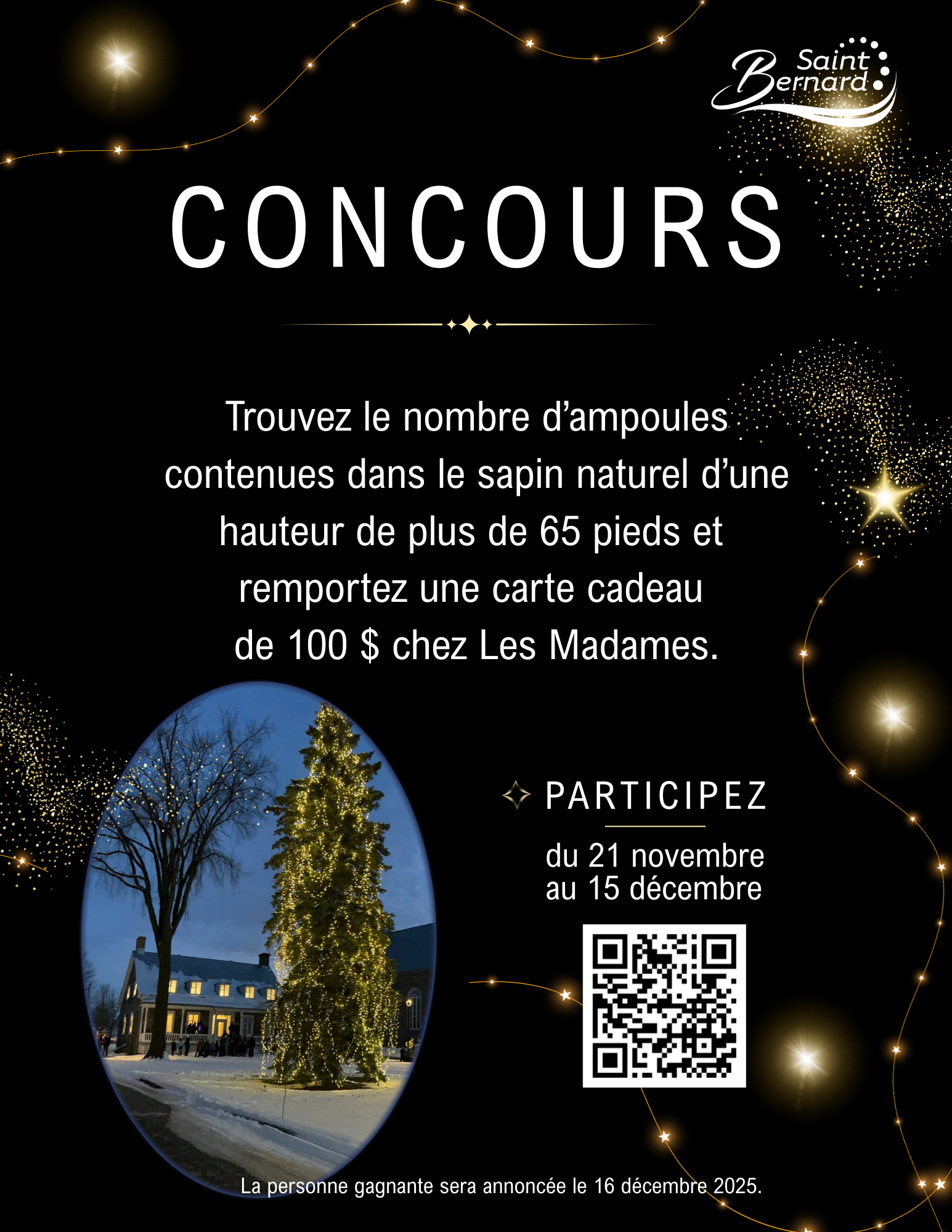 Trouvez le nombre d’ampoules contenues dans le sapin naturel d’une hauteur de plus de 65 pieds et courrez la chance de remporter une carte cadeau d’une valeur de 100 $ au café-boulangerie Les Madames.